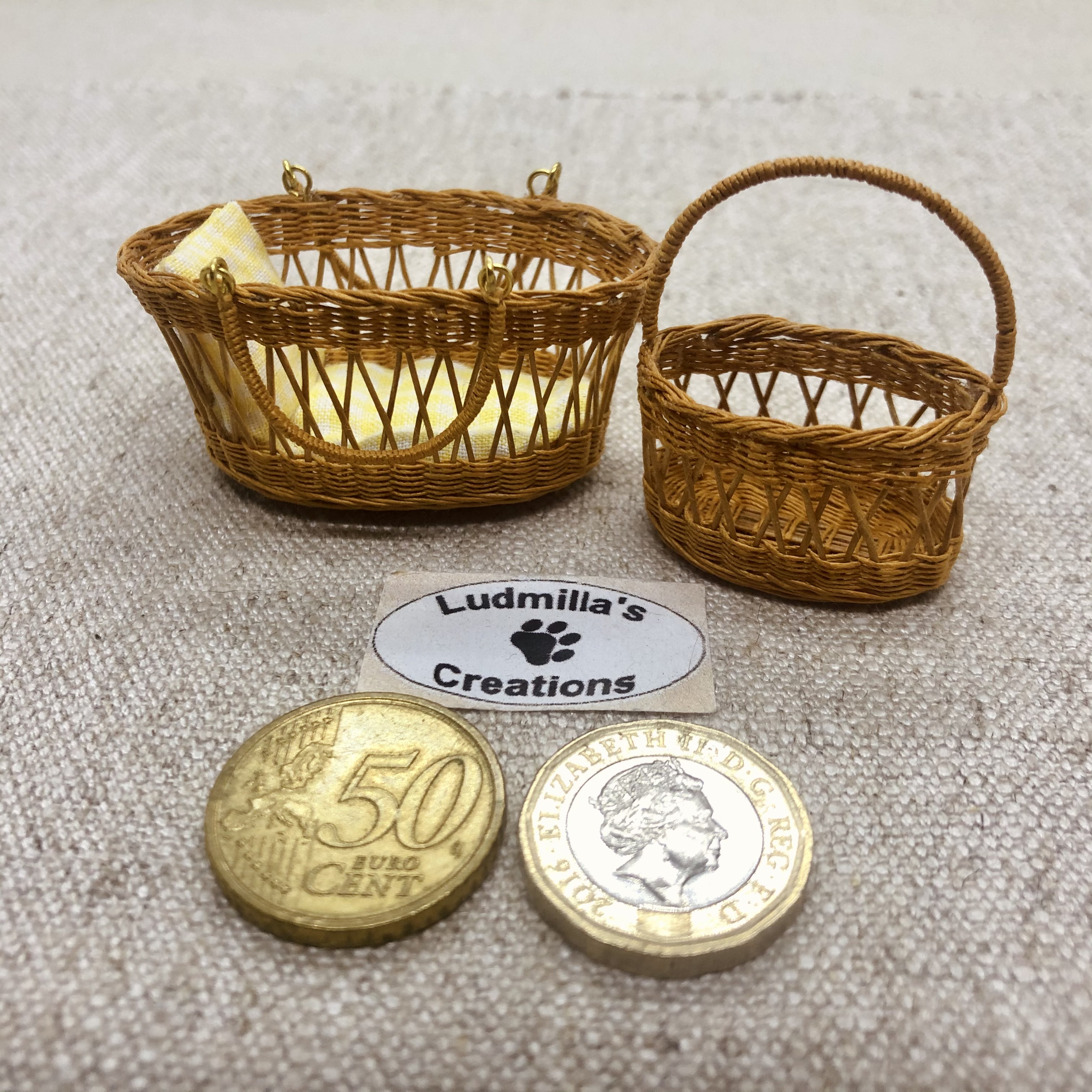 Baby set : baby carrier basket and basket for baby products. They are made of linen thread following the techniques used for the real ones. The baby basket has a quilted mattress and a small pillow.